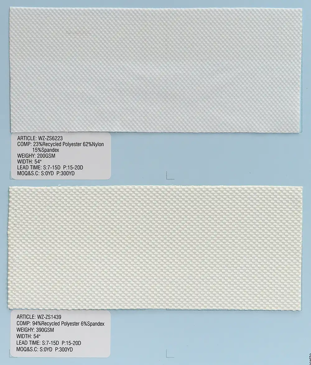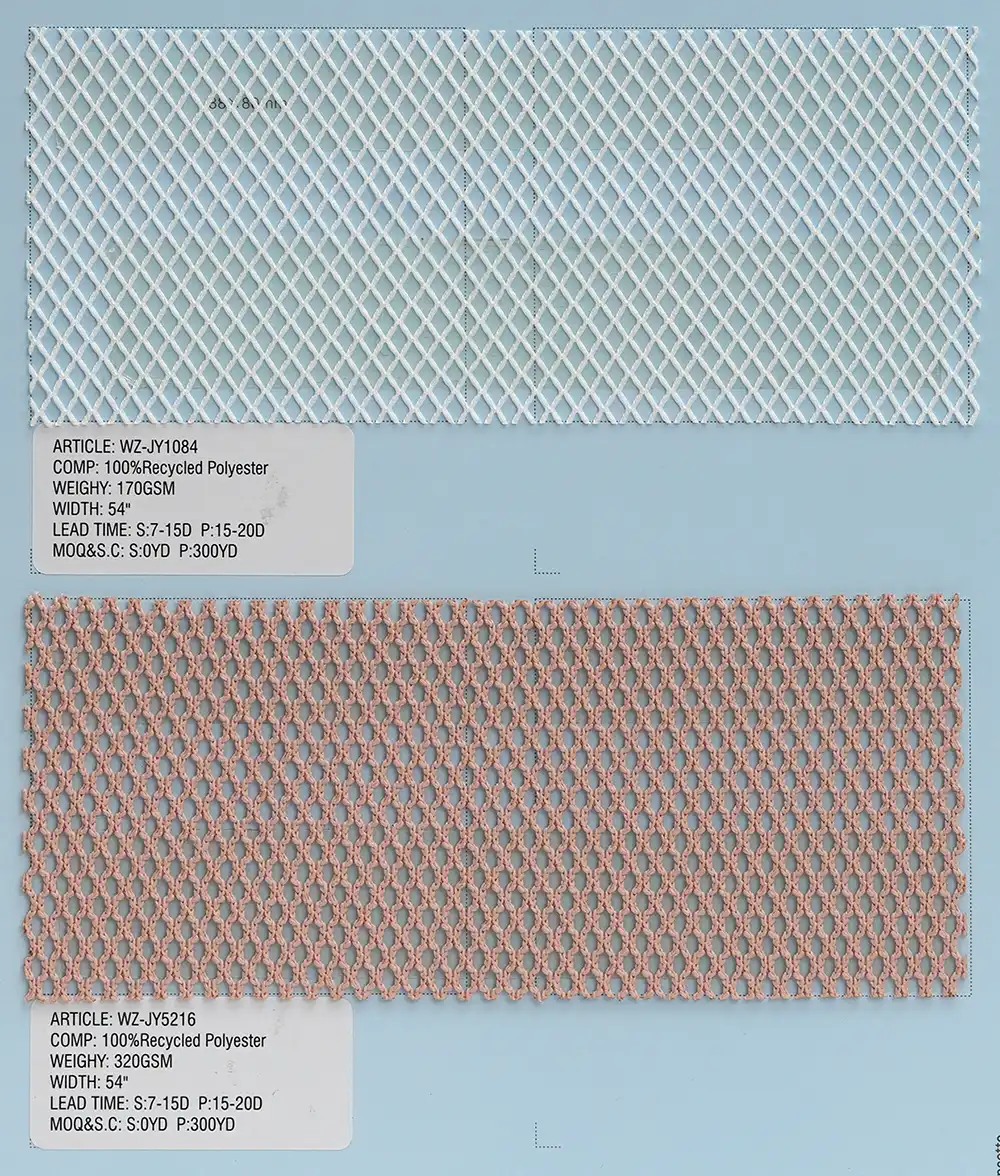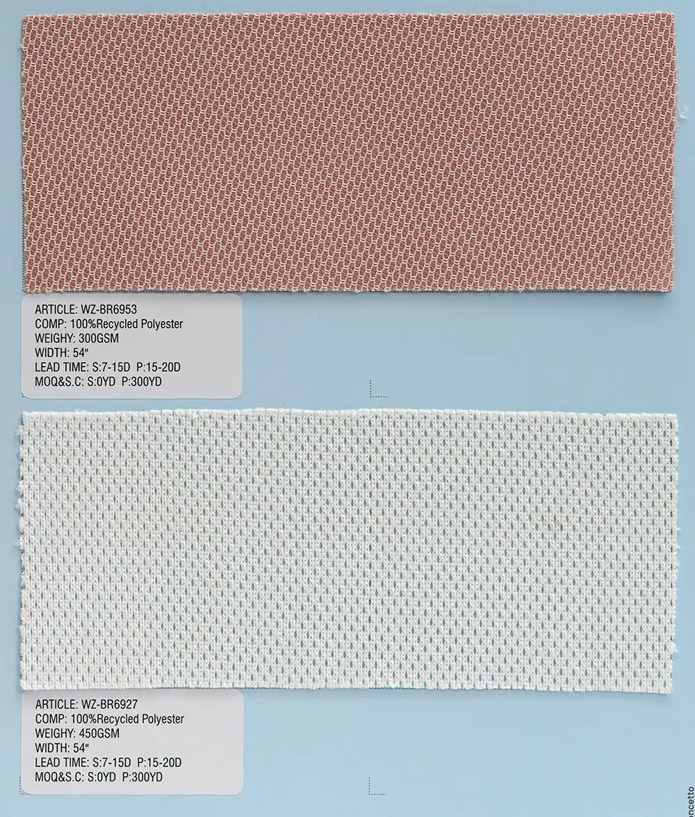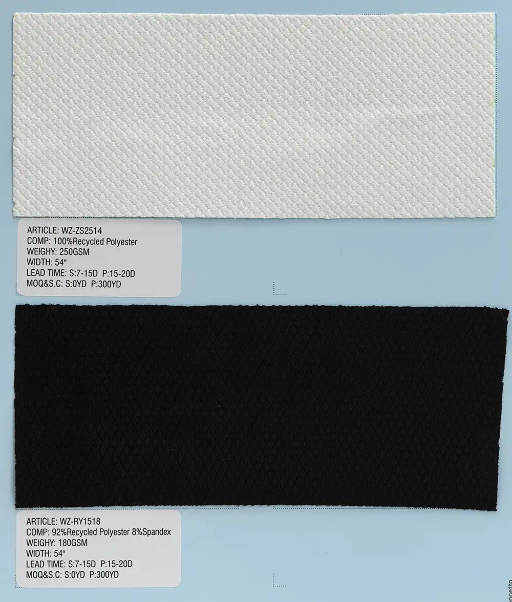 这是一种采用经编工艺制成的针织面料,主要选用100%再生聚酯纤维,也可搭配尼龙或氨纶进行生产。经编技术赋予面料结构紧密稳固,具备优异的尺寸稳定性与抗皱性能,质感持久平整